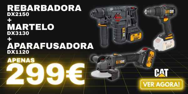 -11%ENTREGA IMEDIATAKit Máquinas 18V Aparafusadora DX1120 + Martelo DX2150 + Rebarbadora DX3130 CAT DXK301Special Price 269,11 € Preço Regular 303,06 € -